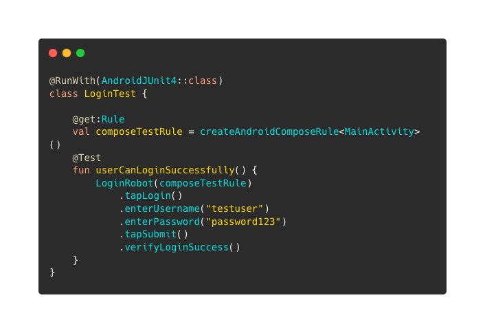 Let’s look at a simple Android Jetpack Compose login test using the Robot pattern.